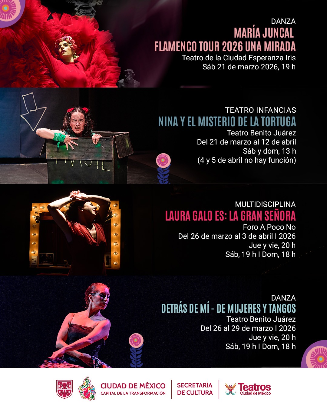 Para conocer la cartelera completa y los detalles de cada obra, visita la Cartelera de la Ciudad de México y sigue las redes sociales de la Secretaría de Cultura capitalina.
